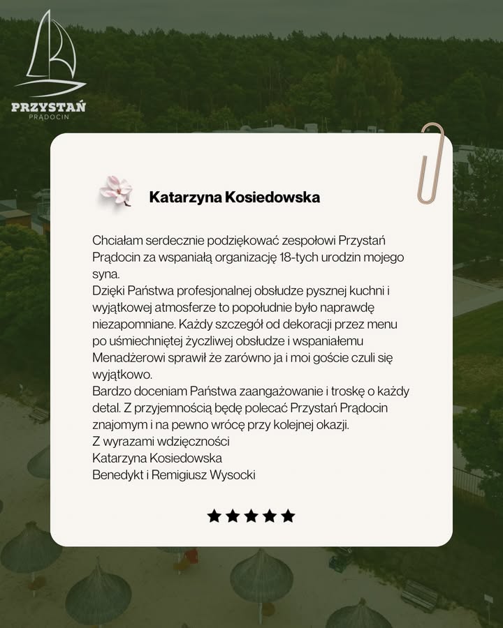 Dziękujemy Pani Katarzynie za piękne słowa i zaufanie, jakim obdarzyła Przystań Prądocin, organizując 18. urodziny swojego syna właśnie u nas.
